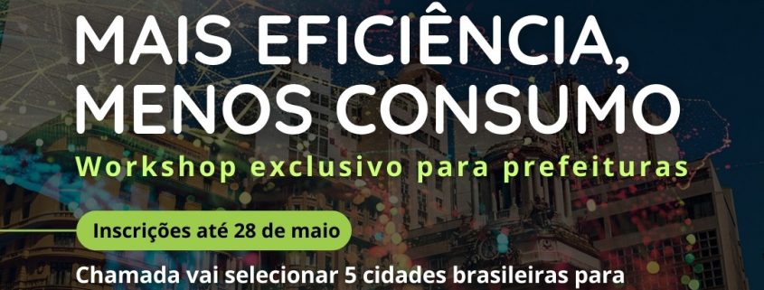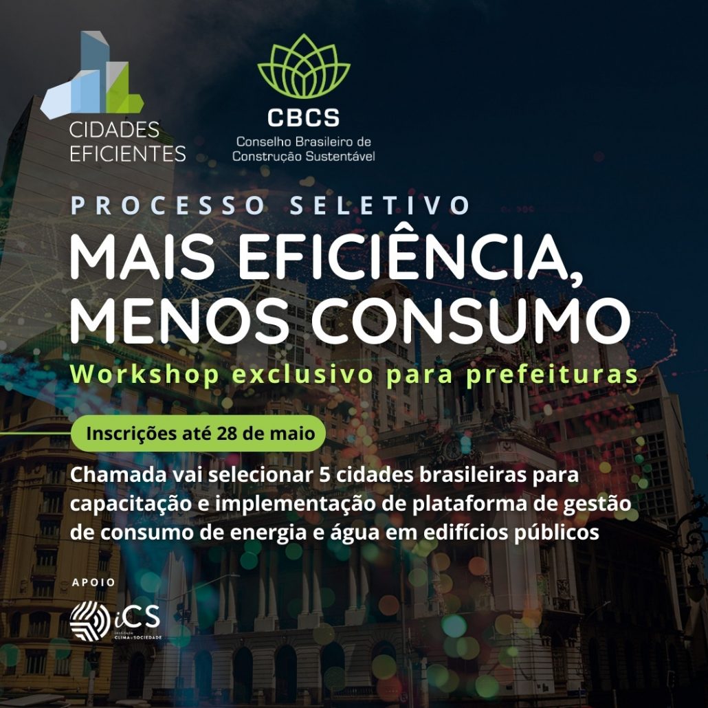 Estão abertas as inscrições para processo seletivo do workshop MAIS EFICIÊNCIA, MENOS CONSUMO oferecido gratuitamente pelo Programa Cidades Eficientes – uma iniciativa do Conselho Brasileiro de Construção Sustentável (CBCS) com apoio do Instituto Clima e Sociedade (iCS), organização filantrópica que apoia projetos e instituições dedicados ao enfrentamento das mudanças climáticas e soluções sustentáveis. Trata-se de uma chamada pública para seleção de cinco municípios brasileiros que serão contemplados com capacitação e implementação gratuita da plataforma de gestão de consumo de energia e água para edificações municipais.